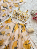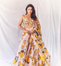 The Golden Butterfly Lehenga shines with graceful butterfly prints in golden and amber tones. Made with pure organza silk, it brings a touch of elegance and flow, perfect for weddings, festivals, and grand celebrations.