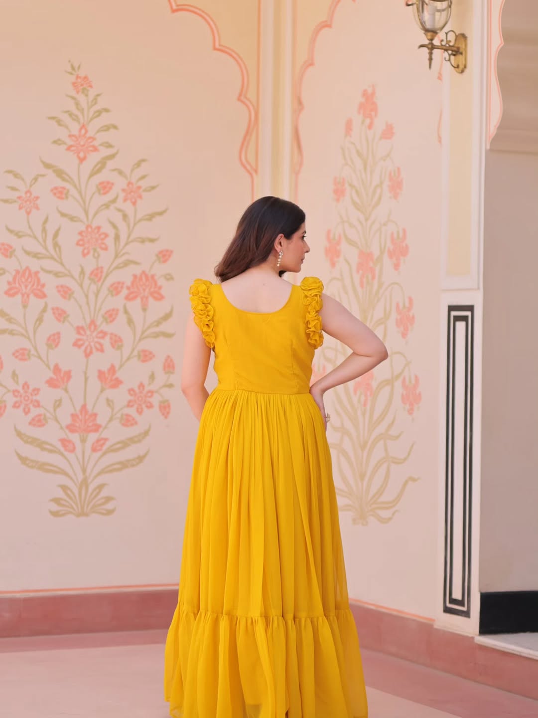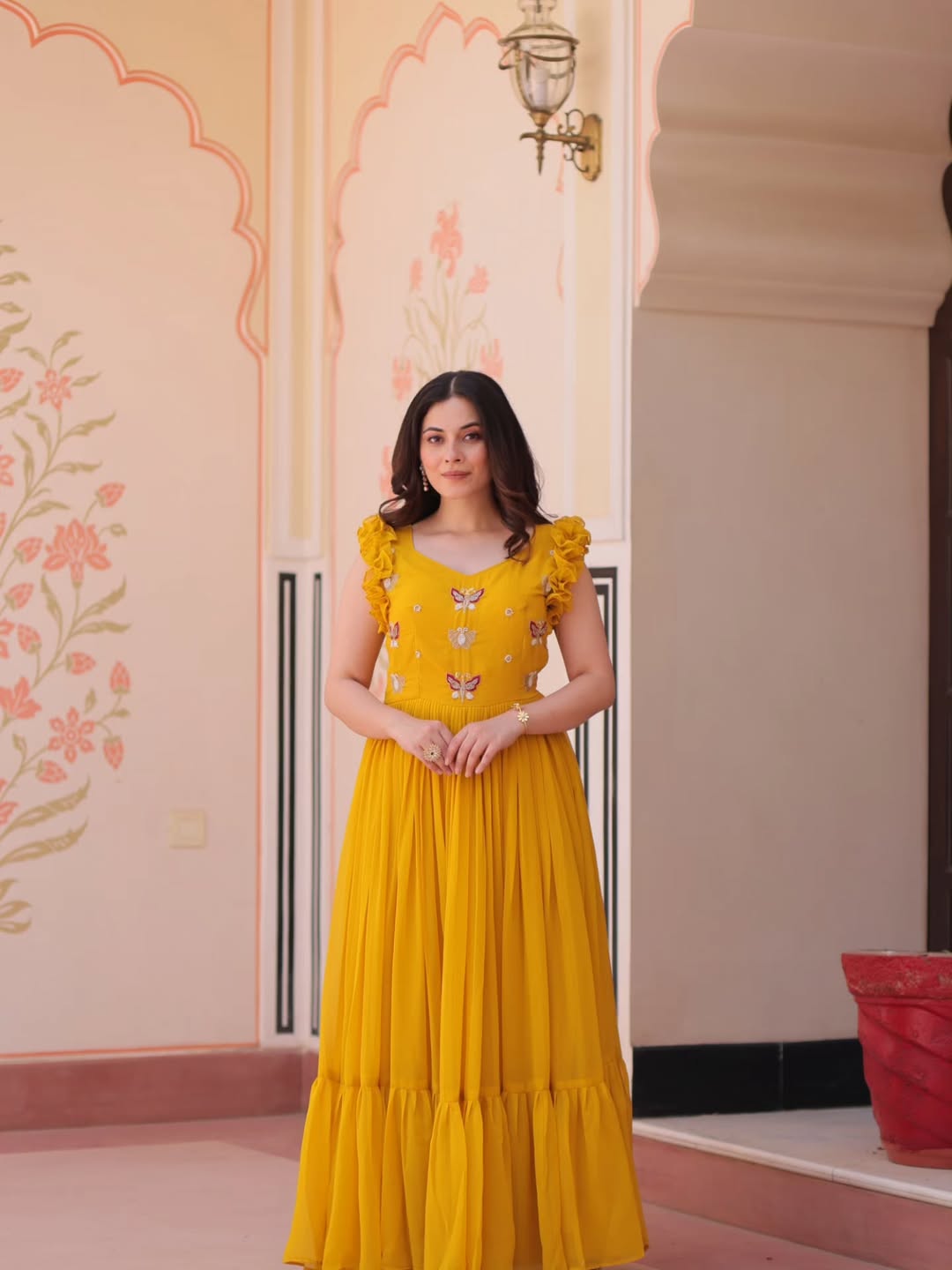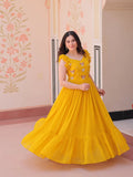 Bright and graceful, this Yellow Golden Marigold Anarkali shines in a warm mustard yellow shade, inspired by festive marigold flowers. With delicate sequins and bead embroidery, along with a grand 7-meter flair, it’s perfect for weddings, haldi ceremonies, and joyful celebrations.