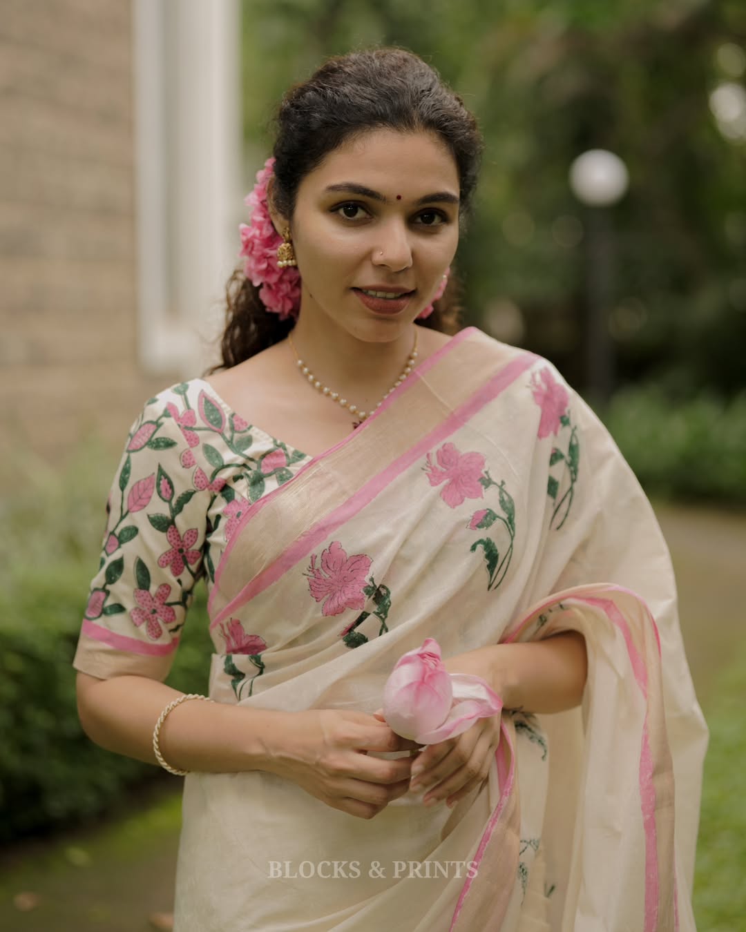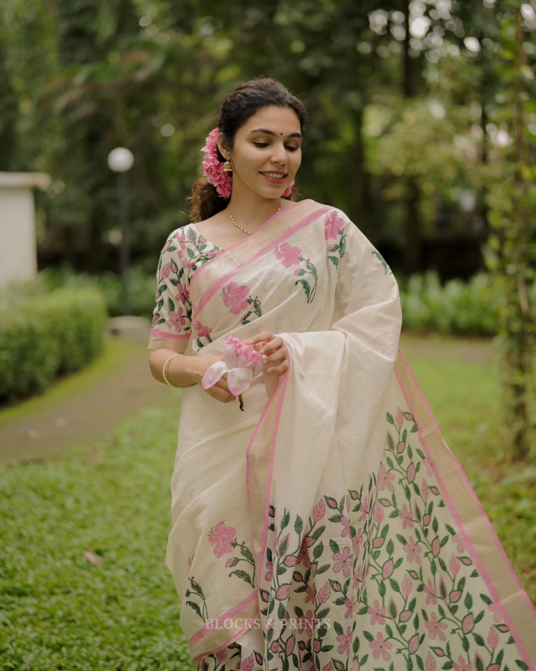 Experience the charm of a blooming garden with our Pink Blossom Saree, a delightful piece that brings together soft elegance and natural beauty. This lovely saree features a gentle off-white base decorated with beautiful pink flowers and green leaves that create a fresh, garden-like feeling. The pretty pink border adds a sweet finishing touch that makes this saree perfect for daytime celebrations and special moments when you want to look graceful and feminine.